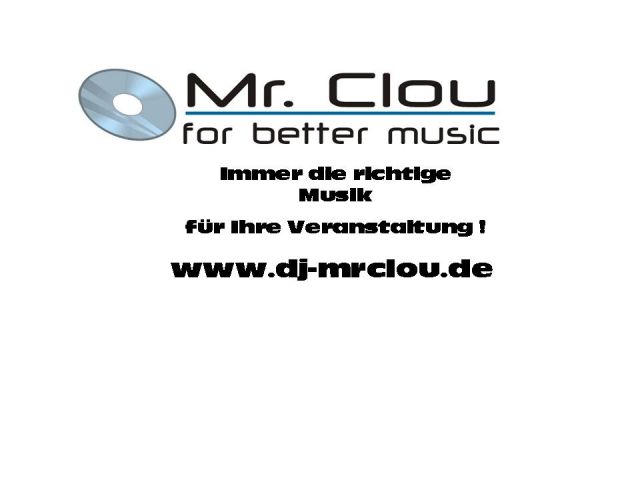 Ob Geburtstagsfeier, Hochzeit, Firmen-, Privat- oder Vereinsfest, Beachparty, Zeltparty, Open Air Events oder ein stimmungsvoller Abend in einem Club, mit ca. 10 000 Musiktiteln hat Mr. Clou immer das passende für jeden Event. Das Equipment für den Abend ( Licht- und Musikanlage - in verschiedenen Größen ) kann natürlich auch gestellt werden.Besuchen Sie doch meine neue Homepage, auf der Sie sich über meine Arbeit als Mobiler Disc Jockey informieren können.